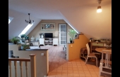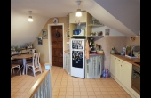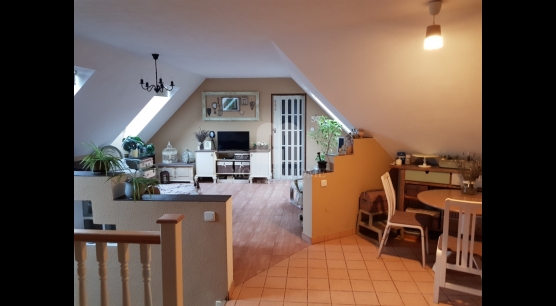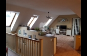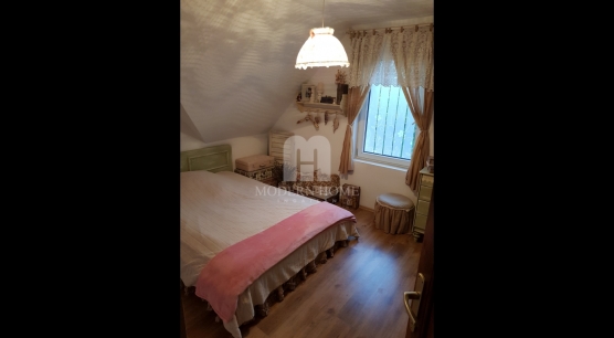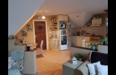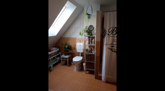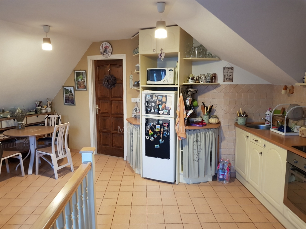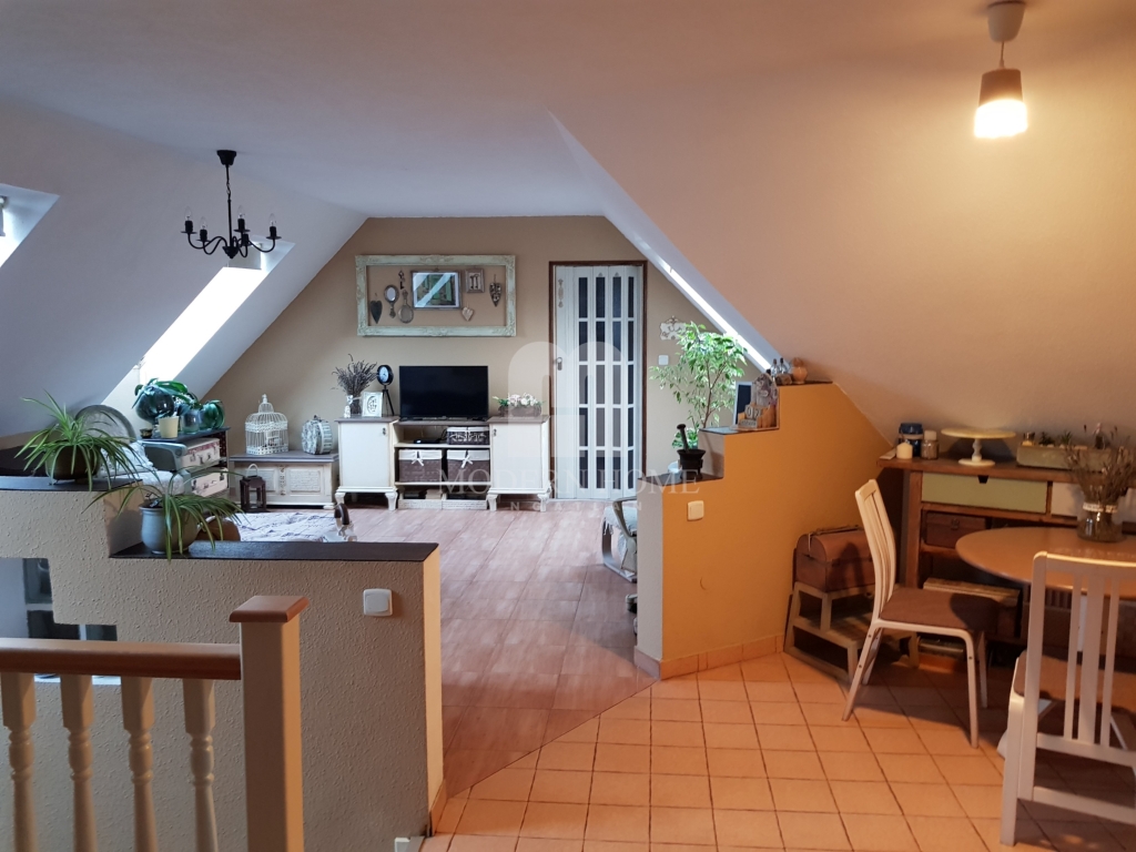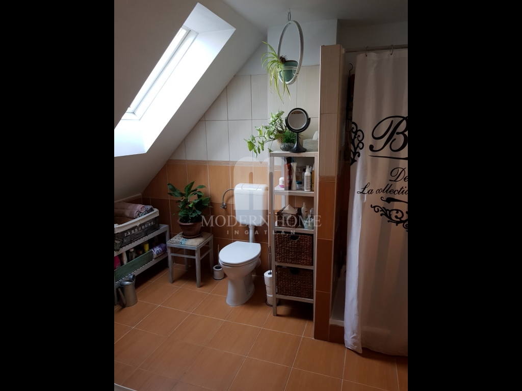 Felső szint: 64 nm, 2 félszoba + gardrób + nappali + konyha + étkező + fürdő + wc.