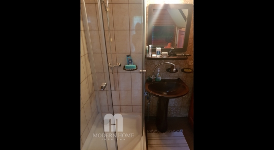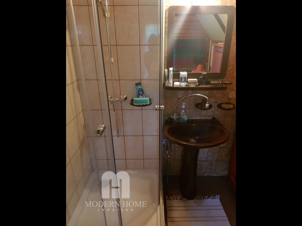 Az alsó szinten ( ami 45 nm ) nappali + fél szoba + fürdő + wc és fedett terasz.
