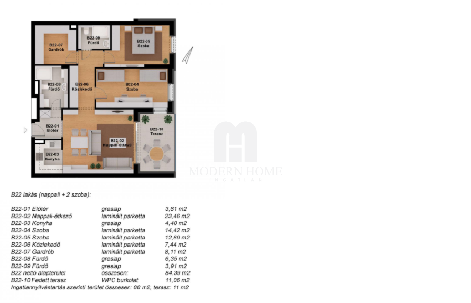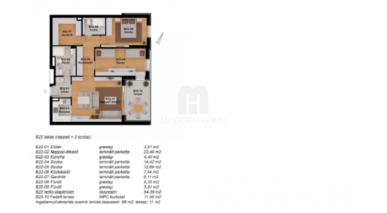 B22 lakás: második emeleti, 88 nm, előtér + közlekedő + amerikai konyha + nappali + érkező + 2 szobás + gardróbos + 2 fürdőszobás ( duplakomfortos ), ehhez tartozó 11 nm terasz!
